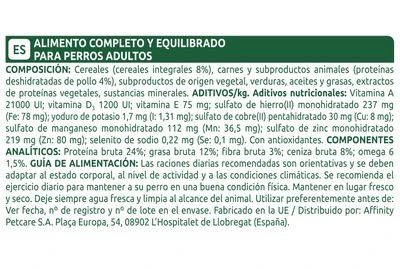 Alimento completo y equilibrado con ingredientes digestibles para perros adultos. Ayuda a la salud de dientes y huesos. Sin aromas, colorantes ni conservantes artificiales. Con 24 % de proteína