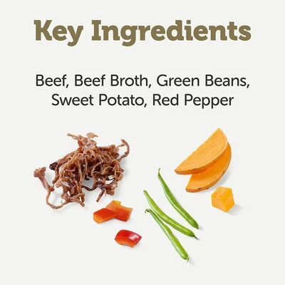 En función de la variedad, se compone de tiernas tiras de carne, pescado o ave. No contiene cereales, pero sí verduras ricas en sustancias vitales que suministran vitaminas, antioxidantes y minerales. Además, contiene abundante caldo, lo cual ayuda a tu perro a ingerir más líquido.