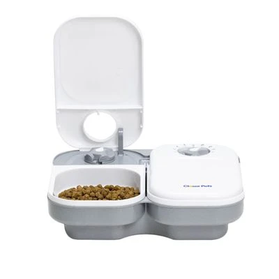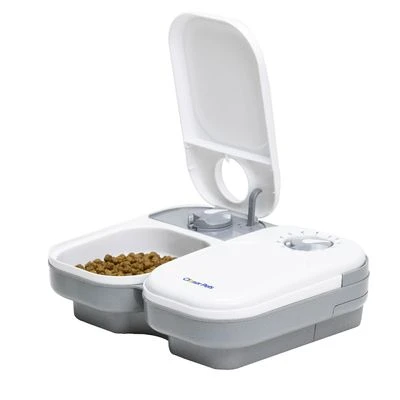 Comedero automático para gatos y perros pequeños. Funciona con pilas. Dos cuencos de 2 x 400 ml. Temporizador de 48 h que permite a abrir las 2 tapas en distintos momentos.