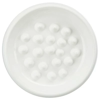 Comedero antivoracidad de cerámica para gatos, el relieve en la superficie de llenado evita que coman demasiado rápido. Apto para lavavajillas. Color blanco.