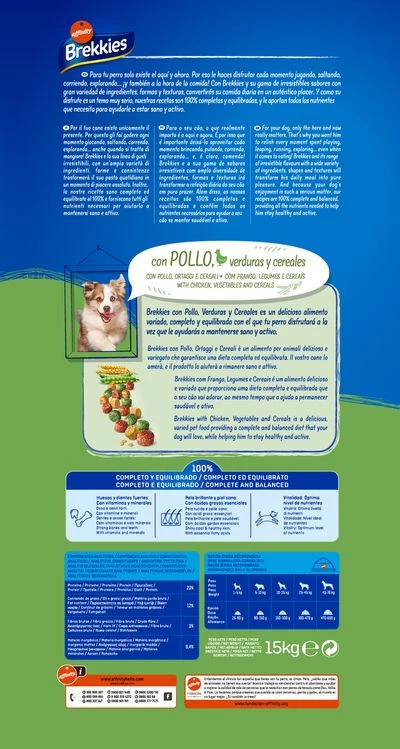 El pienso para perros Brekkies suministr a tu perro todo lo que necesita para una vida sana. Este alimento completo y equilibrado es rico en proteínas para unos músculos fuertes. Además, contiene calcio y fósforo que contribuyen a unos dientes y huesos fuertes.
