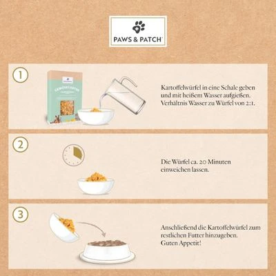 Gracias a su proceso de producción especial y cuidadoso, la fécula de patata es especialmente fácil de digerir, manteniendo su sabor sabroso y natural. Los dados de patata de PAWS & PATCH están hechos con ingredientes 100 % naturales, sin azúcar ni aromas artificiales. Además, el envase está fabricado con materias primas renovables, asegurando la conservación del sabor de los cubitos.