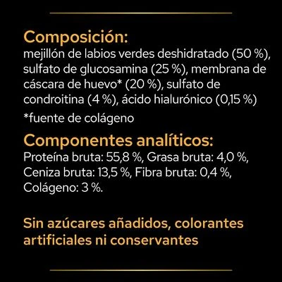- Con glucosamina y condroitina: componentes naturales del tejido cartilaginoso